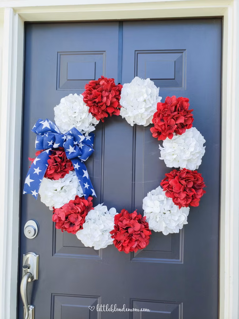 Use faux red and white hydrangeas, sourced from budget retailers, to create a floral wreath on a foam base. Add blue ribbon accents. This compact, budget-friendly design brings an elegant, patriotic 4th of July vibe to a small space.