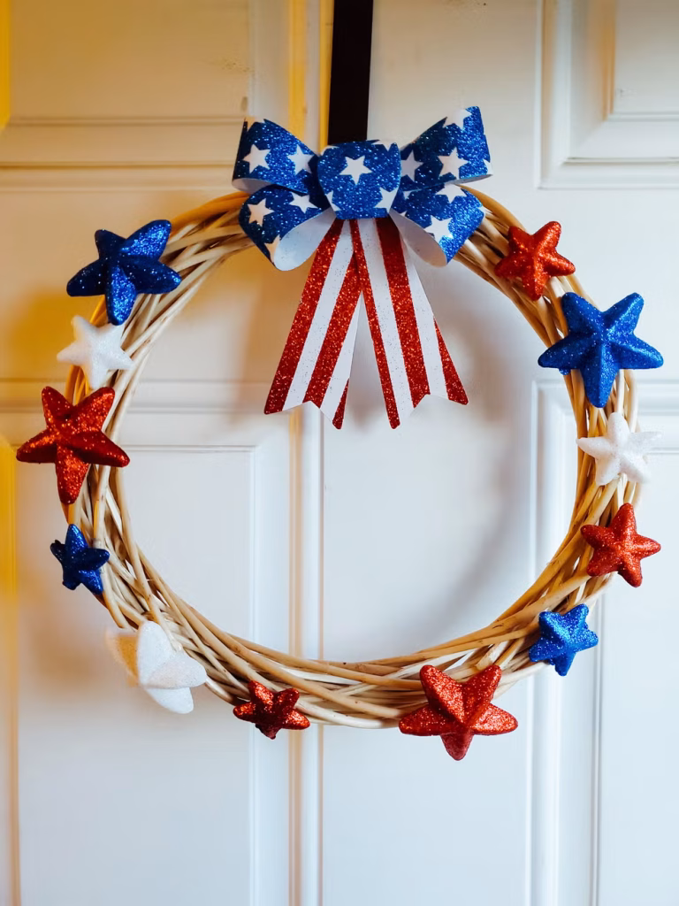 Craft a wreath with a foam base covered in glittery red, white, and blue star cutouts, sourced from craft stores. Add a ribbon bow. This budget-friendly, compact design adds a sparkly, festive 4th of July touch to a small door or wall.
