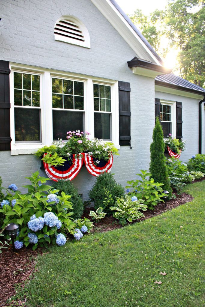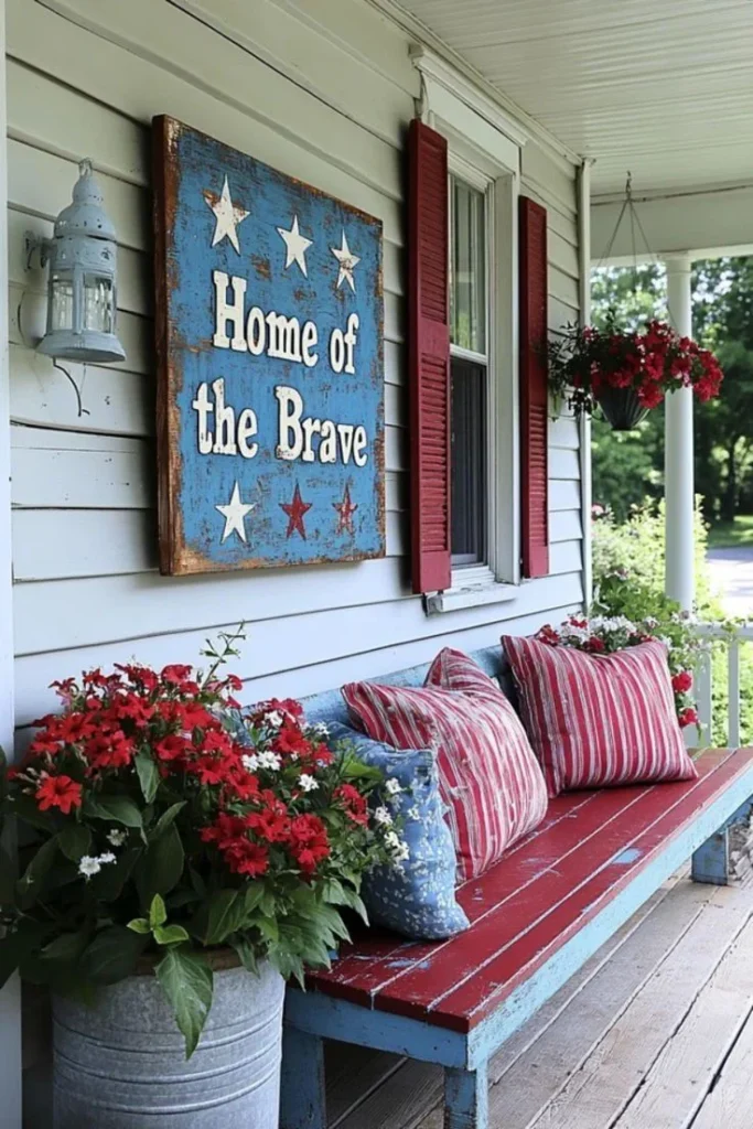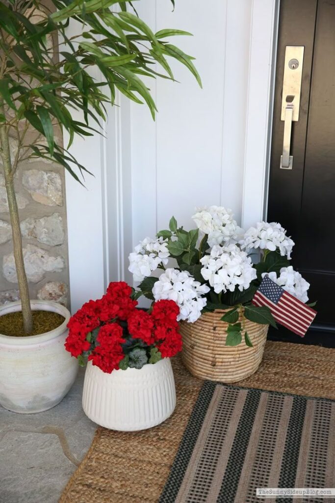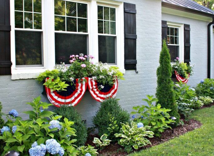 Adorn window boxes with mini bunting flags in patriotic patterns, paired with red geraniums. This charming detail brings festive flair to your home’s exterior and lawn edges.