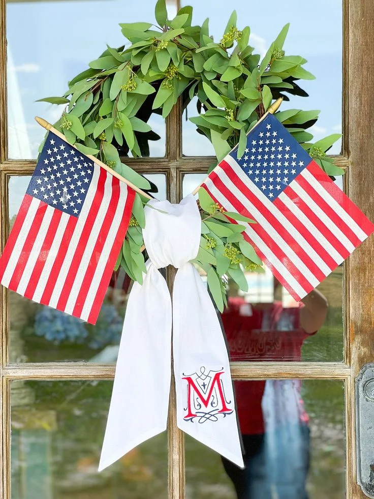 Hang a grapevine wreath with a monogrammed letter in red, wrapped with white and blue ribbons and star ornaments. Place on a lawn post for a personalized, patriotic statement.