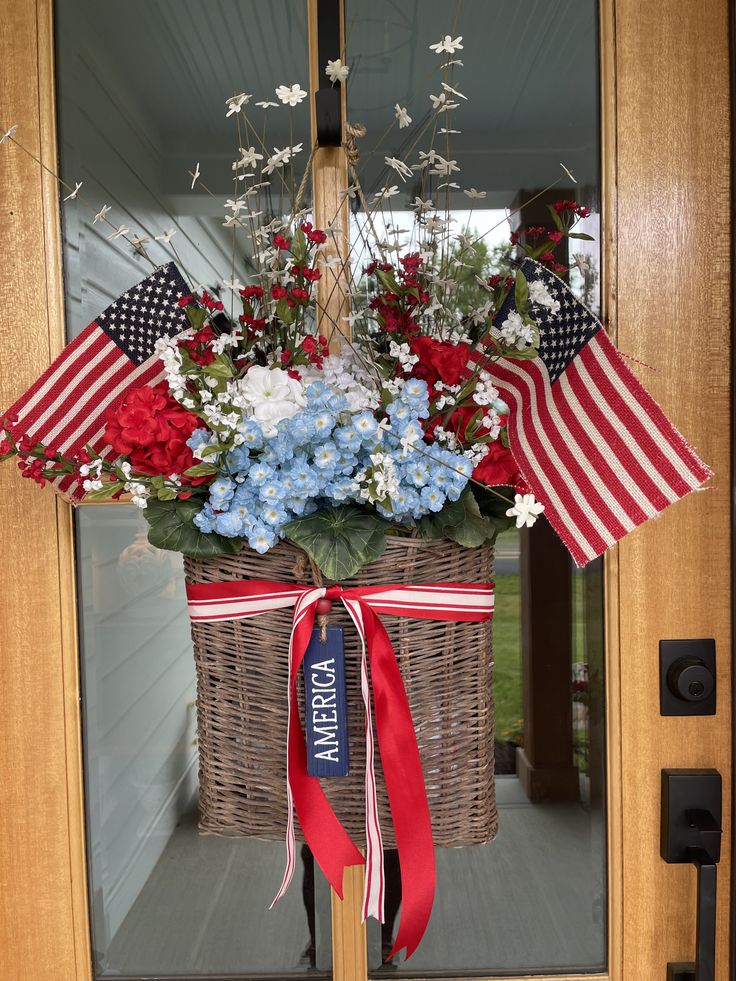 Fill a woven basket with a DIY wreath of red roses, white daisies, and blue ribbons. Hang on a shepherd’s hook or porch post for a charming, rustic lawn accent.