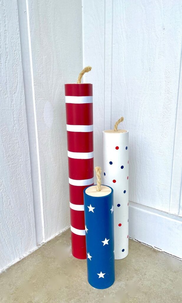 Craft oversized firecrackers from foam tubes painted red, white, and blue, topped with gold tinsel wicks. Place in flower beds for a playful, explosive lawn feature.