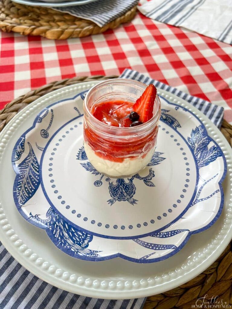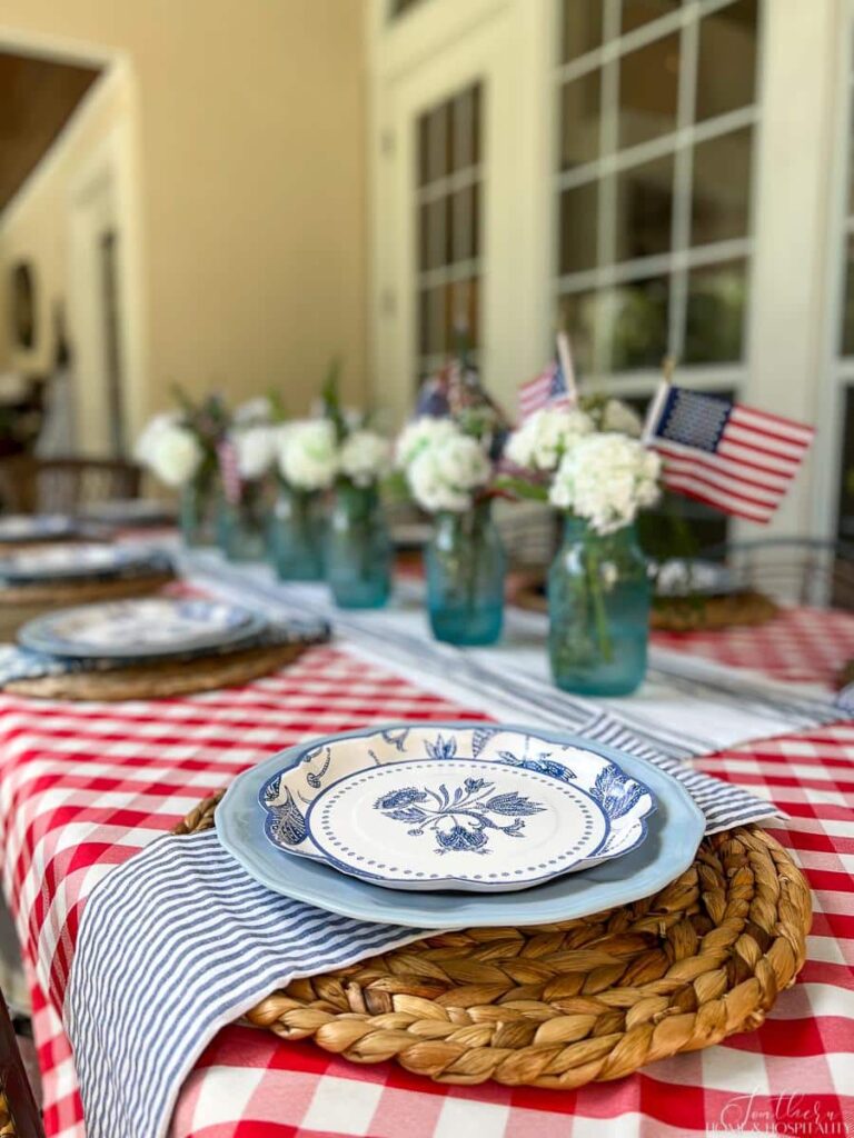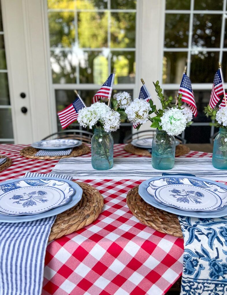 Lay a thrifted blue and white linen runner as the foundation for a centerpiece with a small red vase or candle. This space-saving, budget-friendly design adds a sleek, patriotic elegance to a small 4th of July dining table.