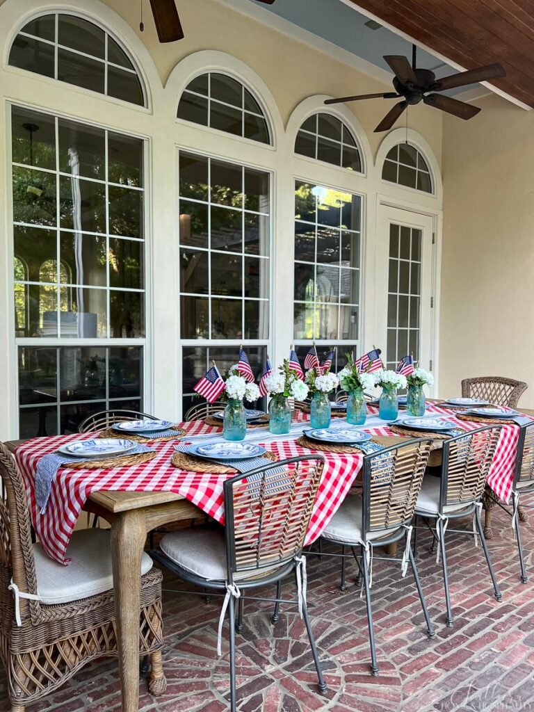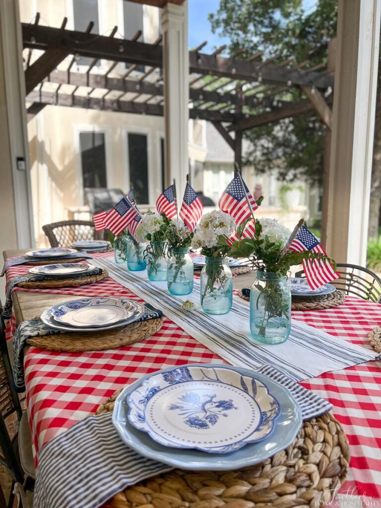Infuse your style with a thrifted tablecloth or runner in bold red, white, or blue patterns, like stripes or stars, topped with a small plant. This affordable, space-efficient design creates a personalized, patriotic centerpiece for a small 4th of July table.