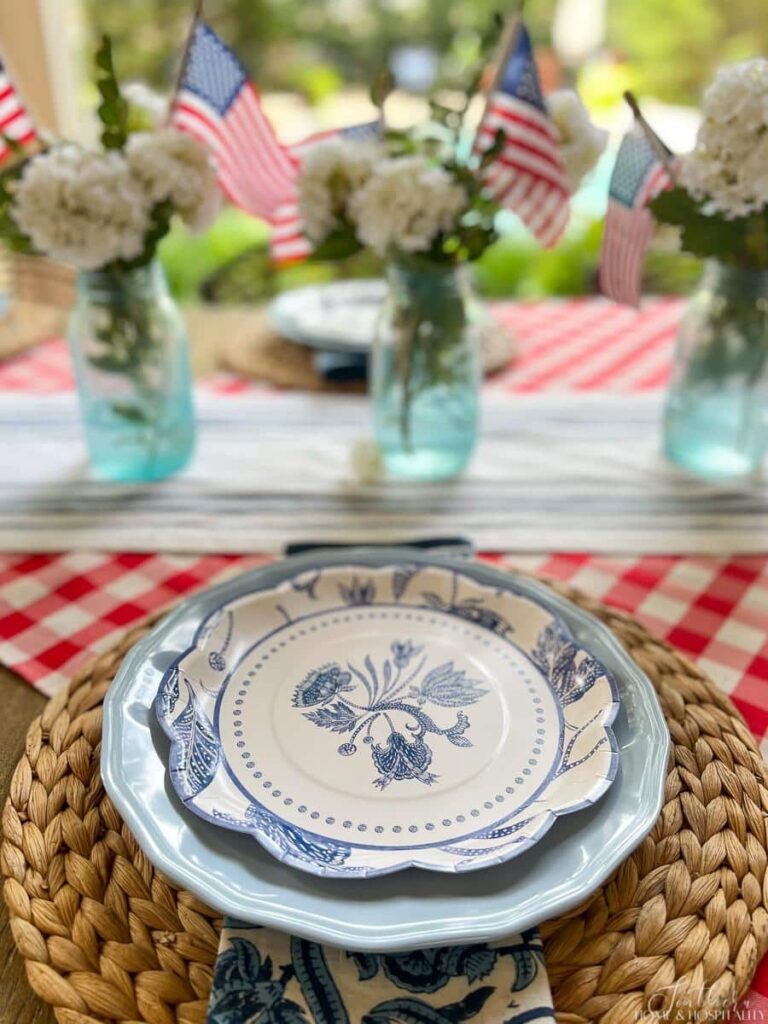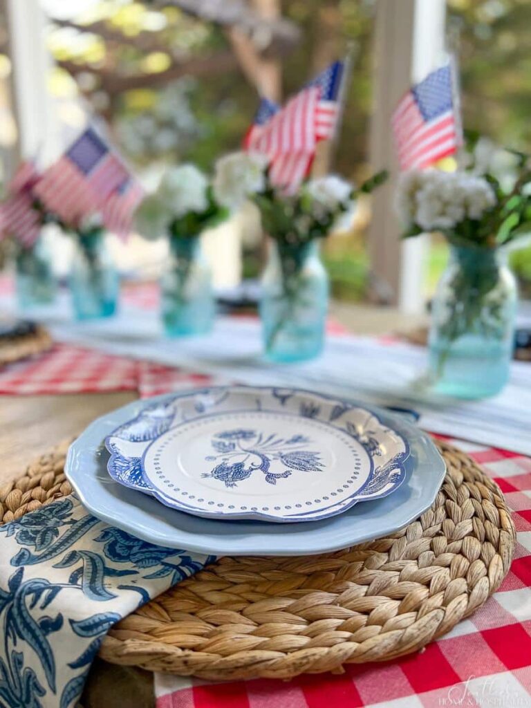 Use red, white, or blue placemats, sourced from budget retailers, as a base for a centerpiece with a small vase or candle. This compact, budget-conscious design adds a layered, patriotic charm to a small 4th of July dining table.