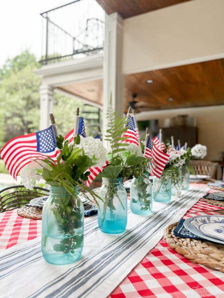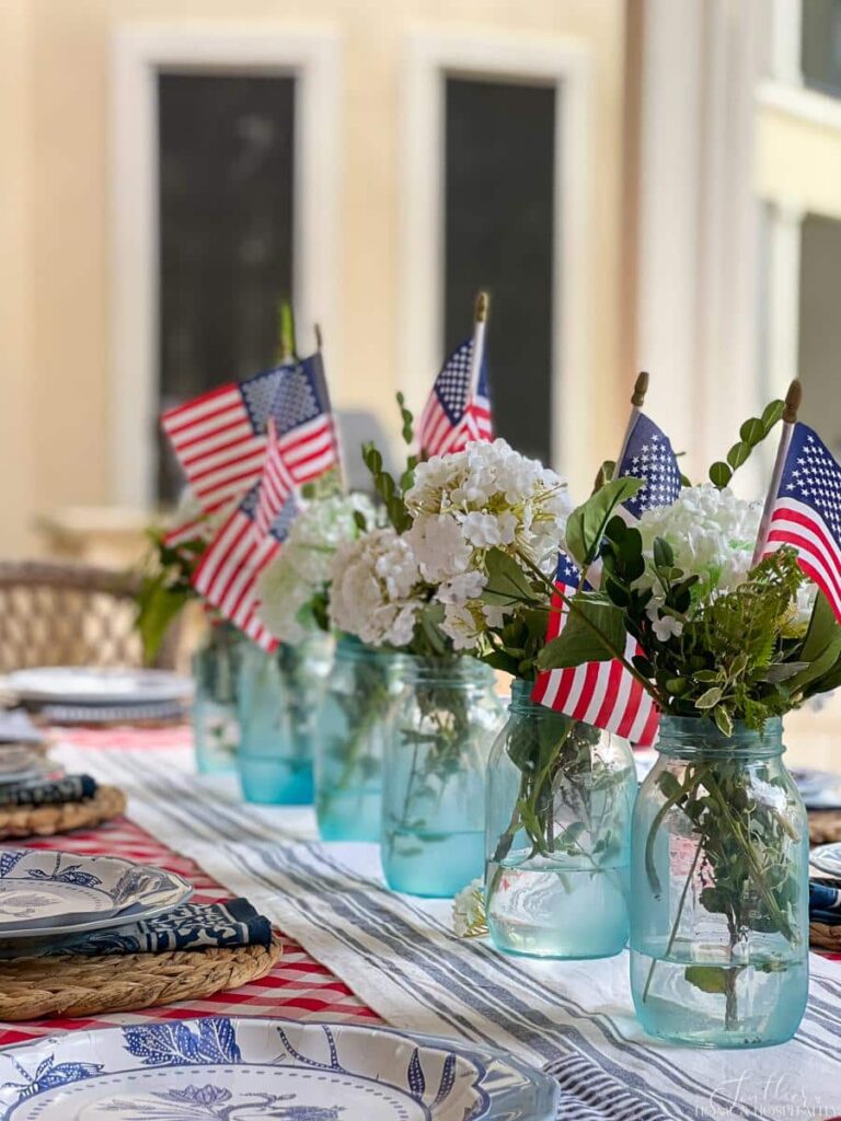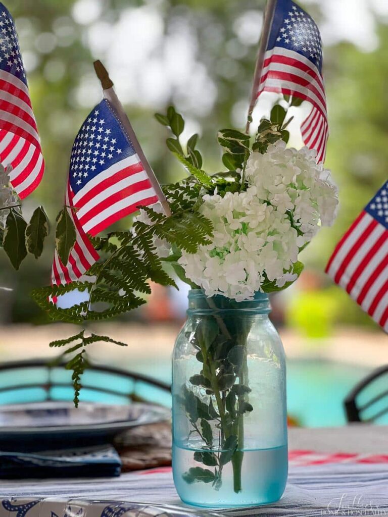 Combine mini American flags with fresh or faux flowers in a mason jar, tied with a red or blue ribbon, for a patriotic centerpiece. This compact, affordable design blends natural and festive elements for a small 4th of July table.