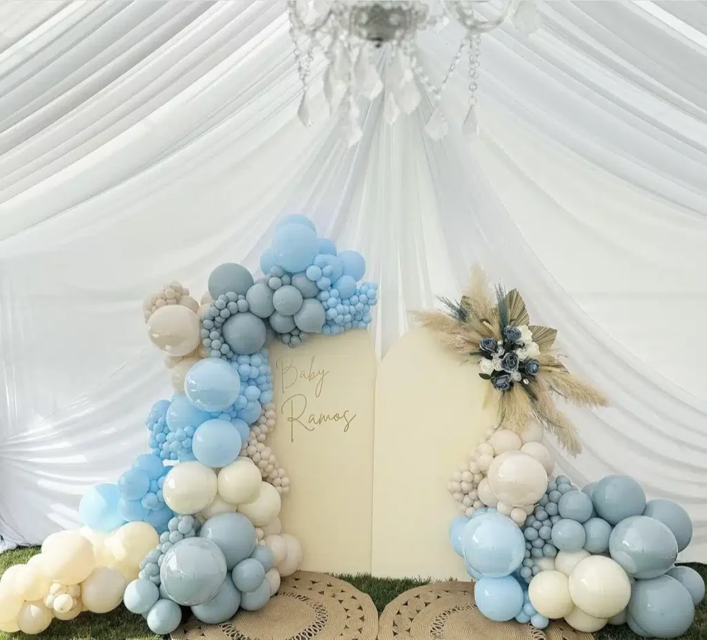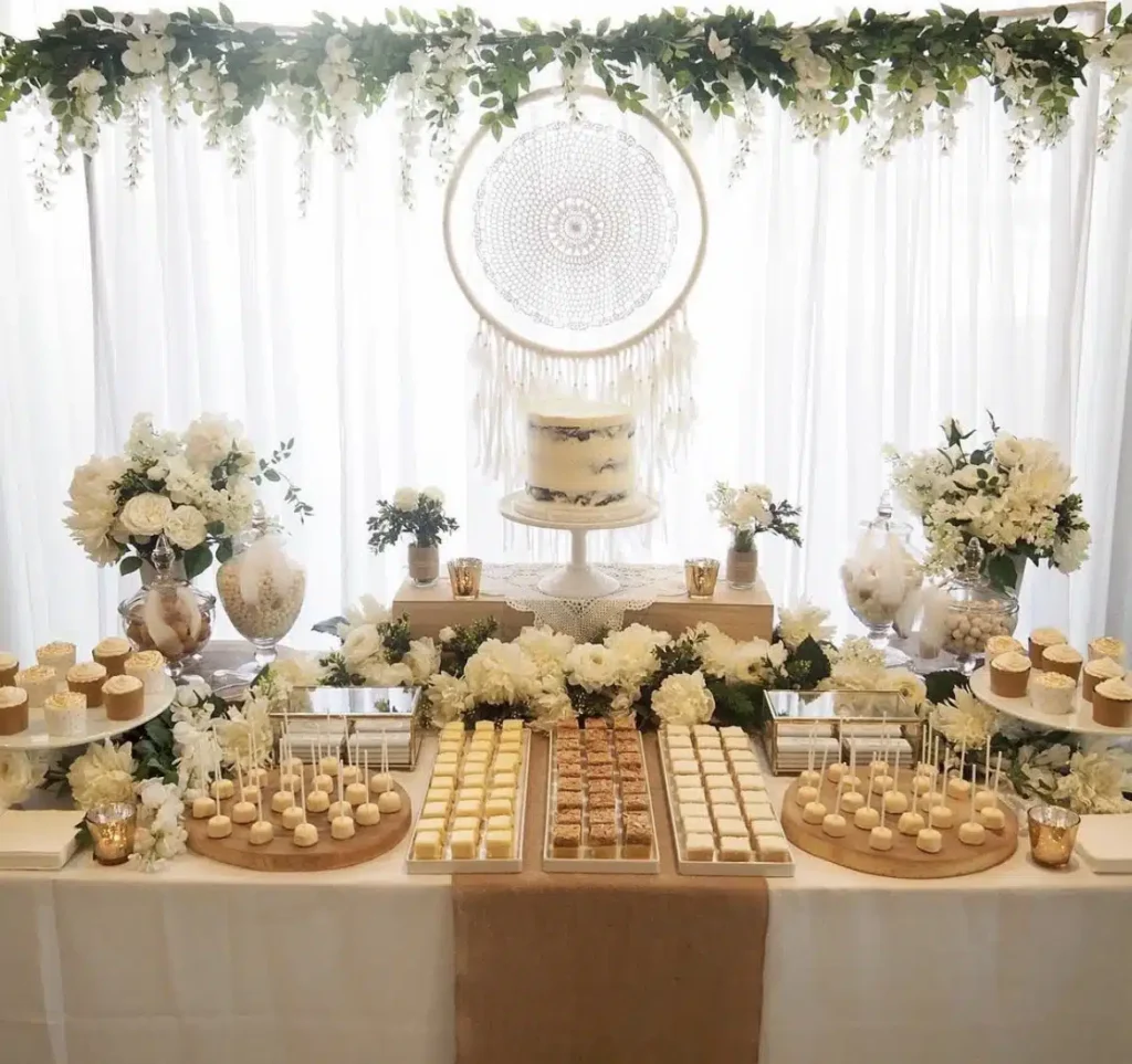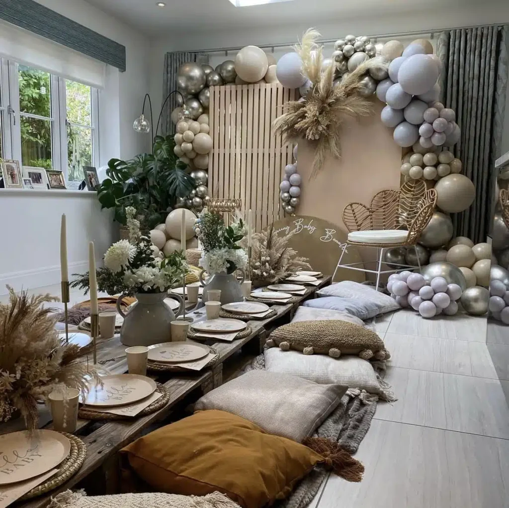 Create a dreamy setup with white linens, lace runners, and ivory balloons. Add white dried florals and candles for a soft, ethereal boho vibe that feels airy and elegant.