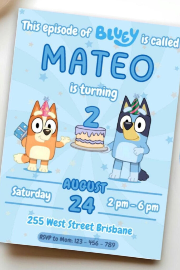 Display a digital Bluey invitation on a screen, featuring animated characters. Frame with paw print garlands for a techy, thematic party kickoff.