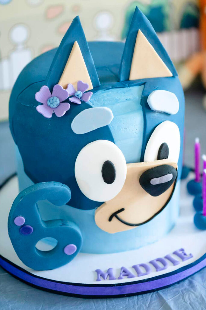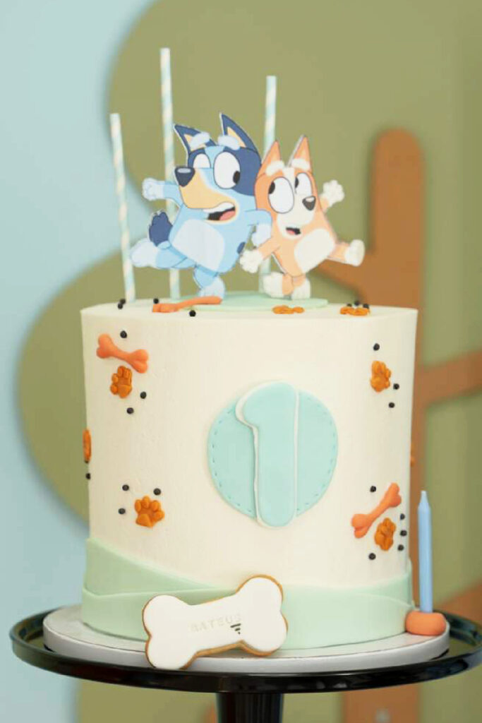 Create a pastel blue cake with a fondant Bluey for a 1st birthday. Add a “Baby Bluey Bash” sign and balloons for a cute, milestone-worthy centerpiece.