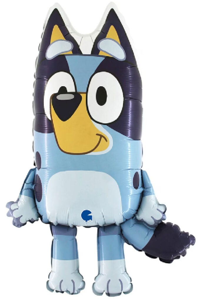Create a cluster of foil balloons shaped like Bluey and Bingo, in bright blue and orange. Anchor with a paw print weight for a vibrant, floating focal point.