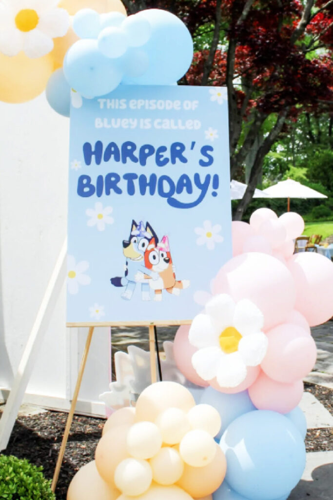 Hang a colorful “Welcome to Bluey’s Party” poster with paw prints and tennis balls. Prop on an easel with flowers for a cheerful, inviting entrance.