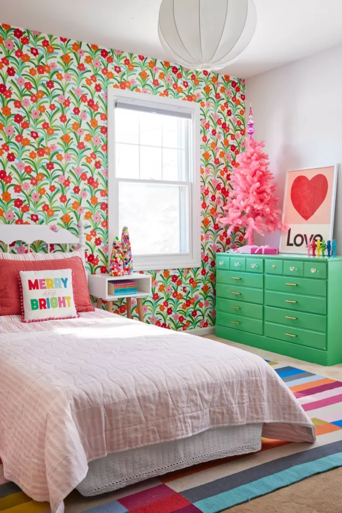 Style your bedroom with pink ornaments and soft pink bedding, accented by silver tinsel. Add a “Merry & Pink” sign for a playful, modern Christmas twist.