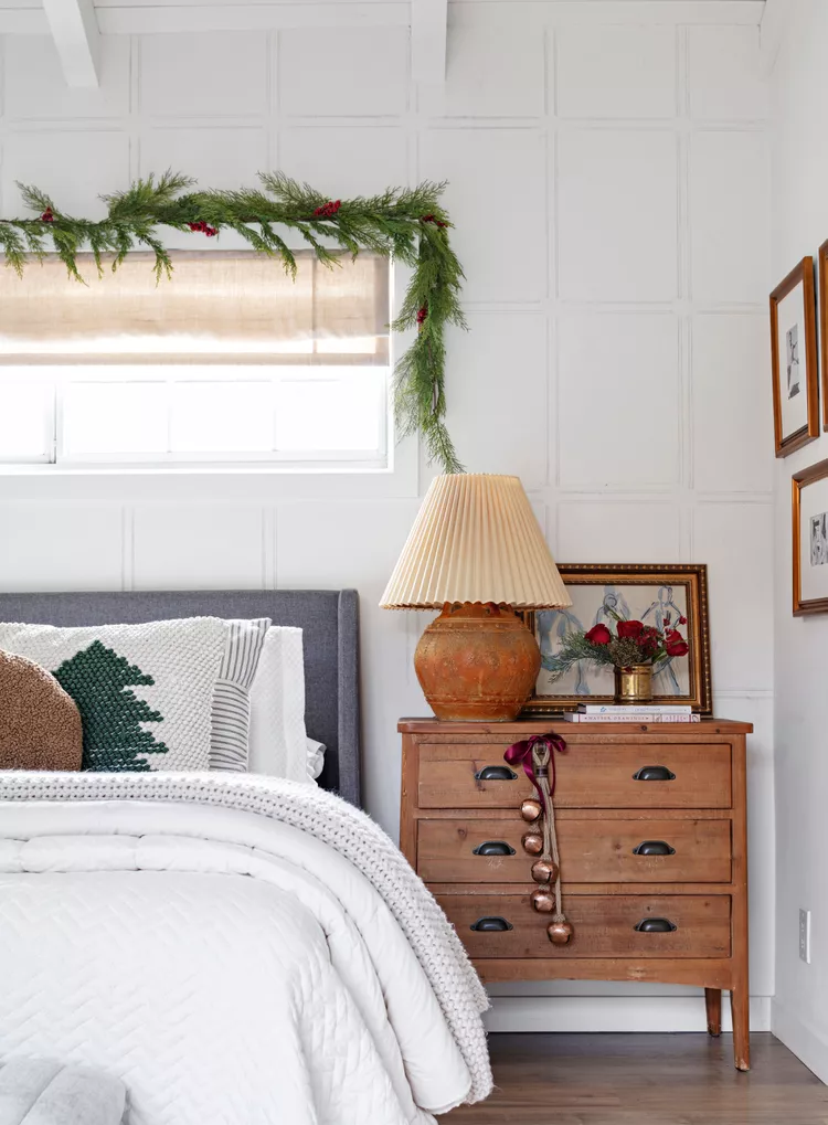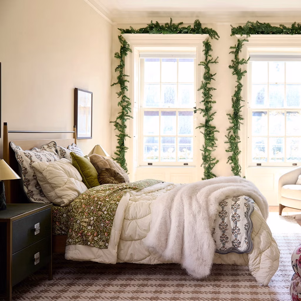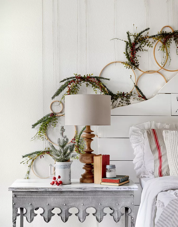 Drape multiple evergreen garlands with fairy lights over your headboard or bedframe. Add red berries for a lush, festive touch that creates a cozy holiday canopy.