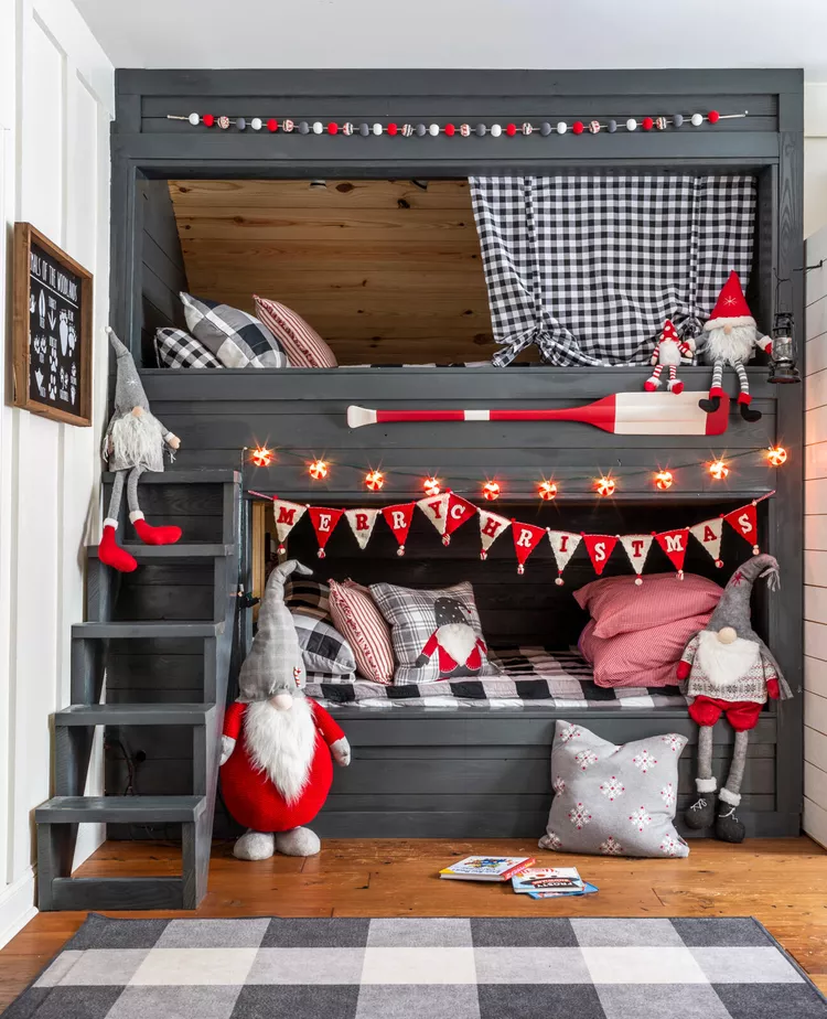 Place plush Christmas gnomes on a child’s bed or shelf, surrounded by mini trees. Add a “Gnome Sweet Gnome” sign for a fun, kid-friendly holiday vibe.