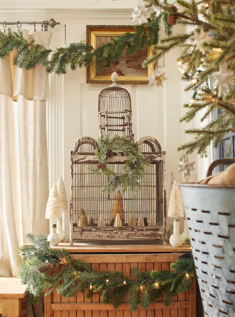Style with flocked garlands and white snow-dusted ornaments on a dresser. Pair with blue bedding for a wintery, frosted Christmas look that feels magical.