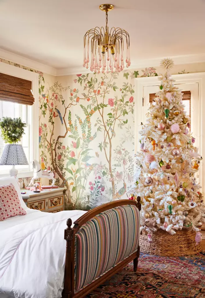 Incorporate pastel ornaments in mint and lavender, paired with soft white bedding. Add a silver star topper for a dreamy, modern Christmas bedroom aesthetic.