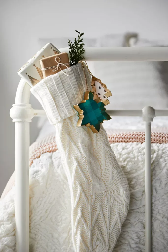 Hang a personalized Christmas stocking from the bedpost, filled with small gifts. Use plaid fabric for a cozy, traditional touch that adds festive charm.