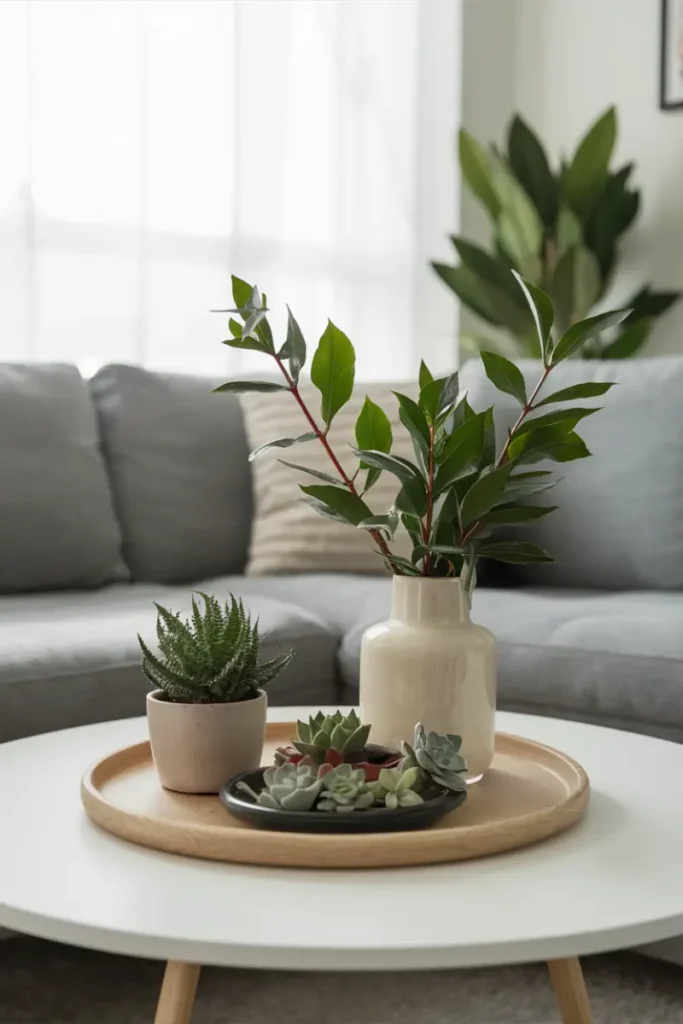 Use a tray with geometric cutouts, filled with white ceramic vases and gold coasters. Add a succulent for a modern, structured look that’s sleek and eye-catching.