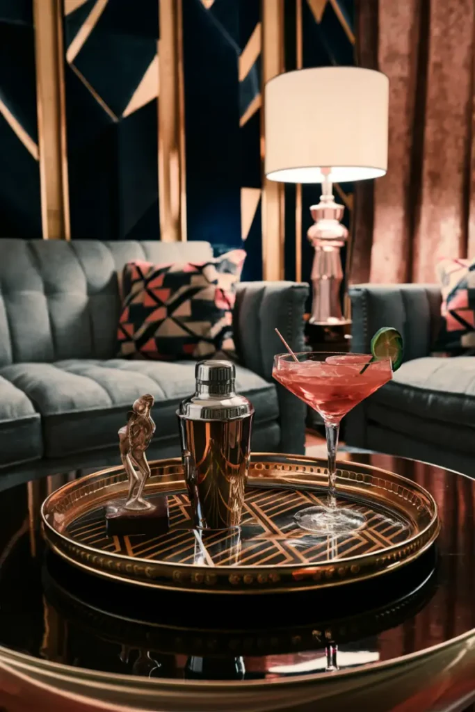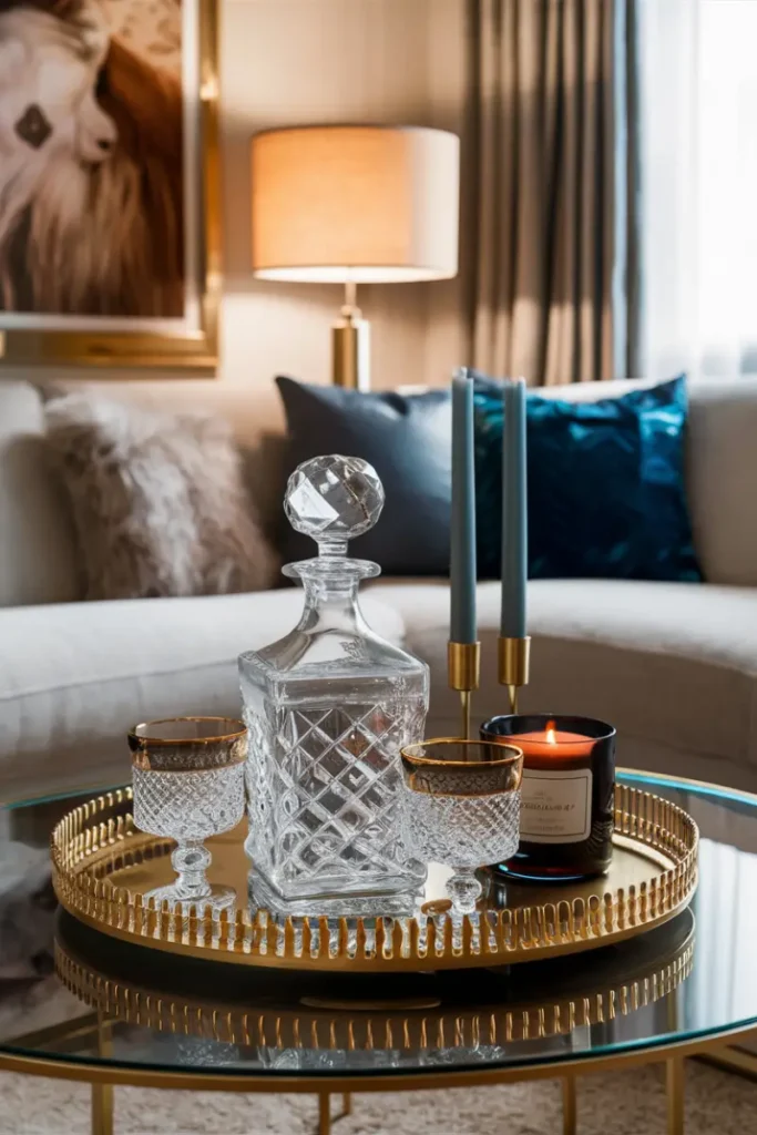 Decorate a black and gold tray with geometric sculptures and a velvet runner. Add a silver snowflake for a holiday nod, exuding glamorous, 1920s-inspired luxury.
