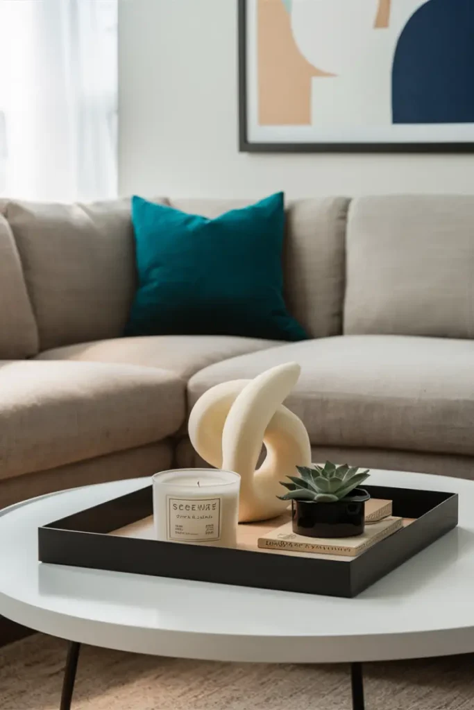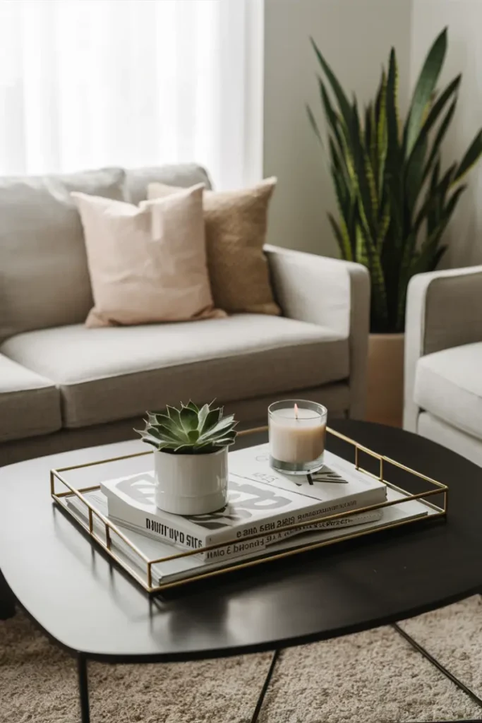 Style a black tray with a single white orchid and a geometric candle holder. Keep it clean and simple for a modern, uncluttered coffee table aesthetic.