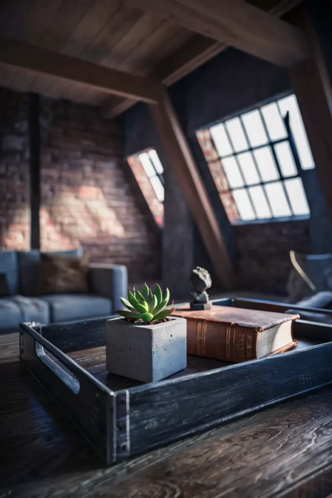 Use a metal tray with exposed bolts, holding black candles and steel coasters. Add a red ribbon for holiday cheer, blending gritty charm with festive warmth.