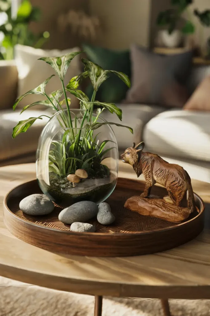 Fill a woven tray with moss, river rocks, and a mini bonsai tree. Accent with wooden beads for an earthy, serene vibe that brings the outdoors in.
