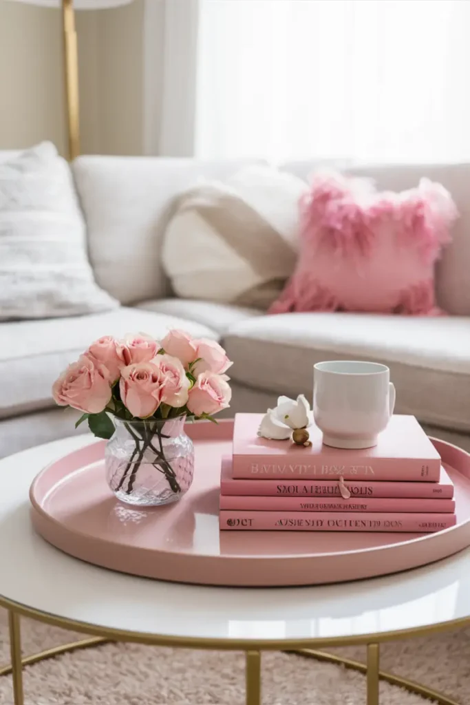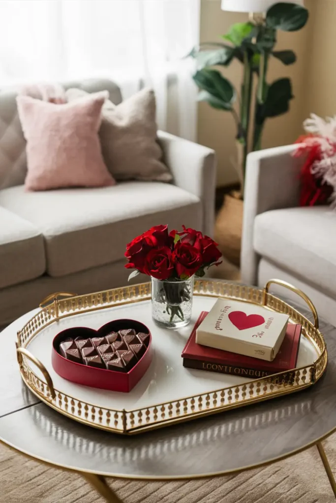 Style a red tray with heart-shaped coasters, pink roses, and a love-themed candle. Add a “Be Mine” sign for a romantic, February-ready coffee table accent.