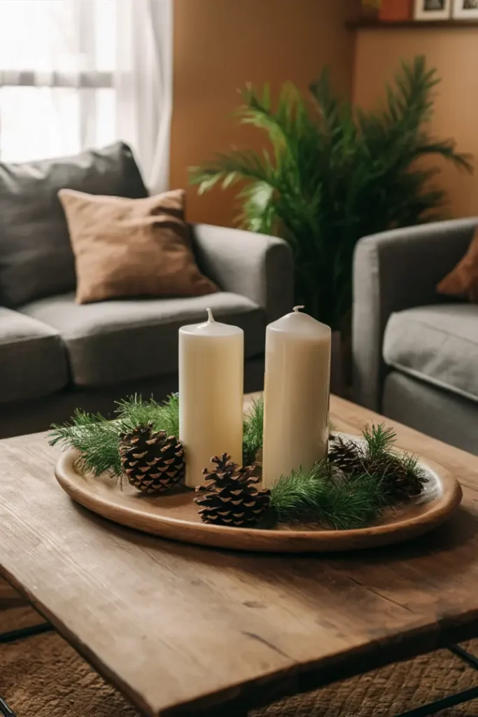 Style a wooden tray with pillar candles and pinecones, nestled on a linen runner. Add a small red berry sprig for a subtle holiday nod, evoking cozy farmhouse warmth.