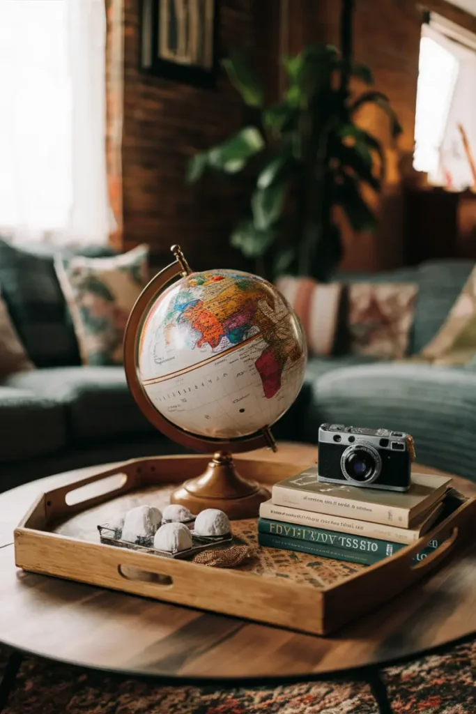 Decorate a tray with a globe, postcards, and a mini suitcase. Add a tiny flag for a 4th of July nod, creating a travel-inspired setup that sparks adventure.