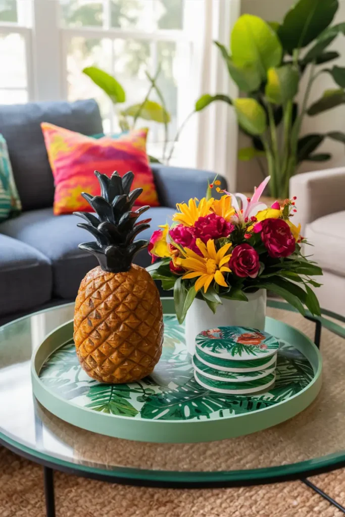 Style a bamboo tray with palm leaves, a pineapple candle, and colorful coasters. Add a star ornament for a festive twist, evoking a sunny, island-inspired retreat.