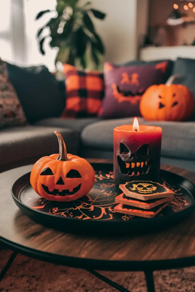 Decorate a black tray with mini pumpkins, orange candles, and bat-shaped coasters. Add a “Boo!” sign for a festive, spooky touch perfect for October gatherings.