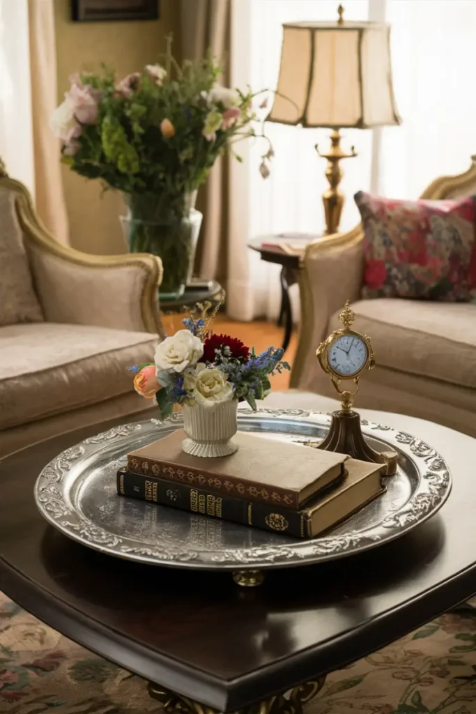 Fill a distressed metal tray with old books, a vintage clock, and a lace doily. Add a small pine sprig for a nostalgic, holiday-inspired look with timeless appeal.