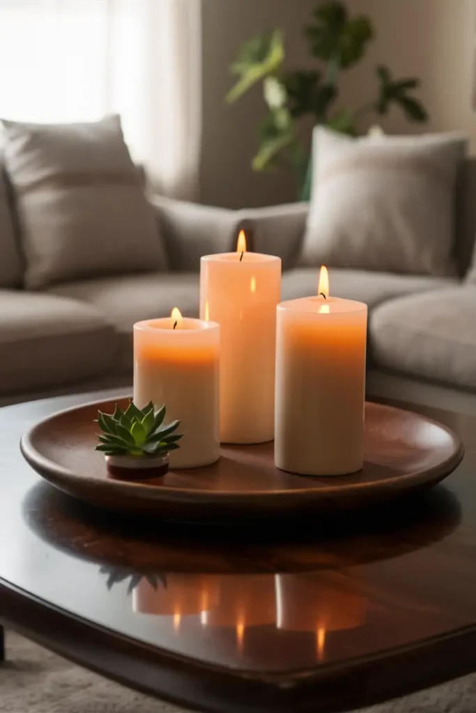 Use a pink tray with rose quartz coasters, blush candles, and a small peony bloom. This gentle, feminine setup adds a warm, inviting glow to your space.
