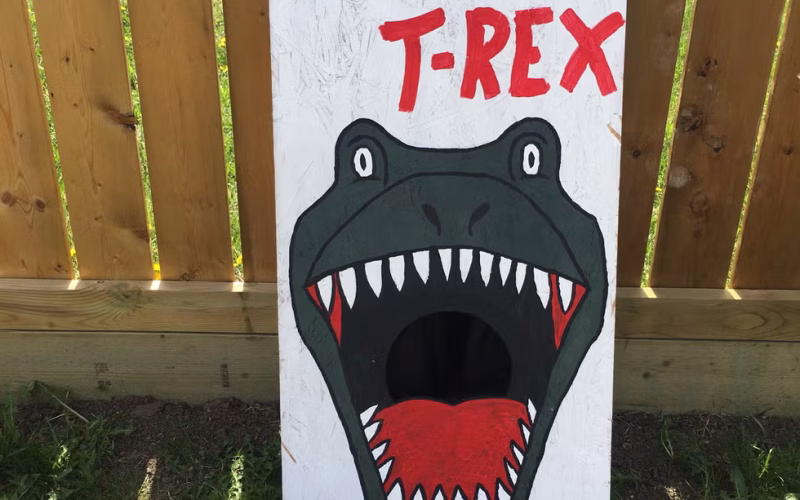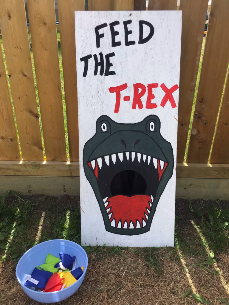 I created a bean bag toss game with a dino target board from cardboard and paint. It kept kids entertained. It’s a nice idea because it’s interactive and space-saving, adding a fun activity to a small dino-themed birthday party.