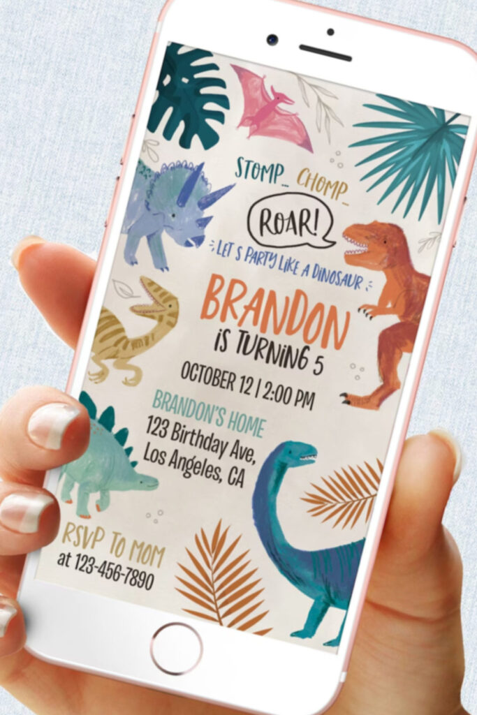 I designed digital invitations with roaring T-Rex graphics to set the party tone. They were easy to send. It’s a nice idea because they’re free or cheap, eco-friendly, and build excitement for a dino-themed birthday in any small setting.