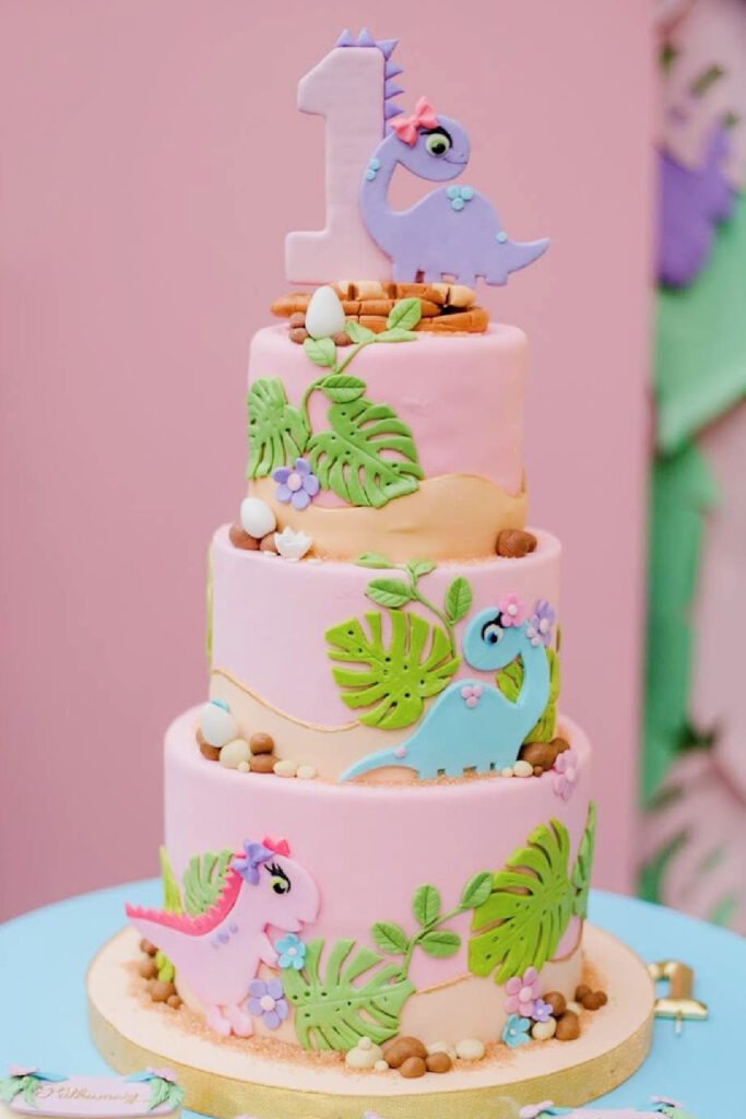 For my niece’s party, I made a pink dinosaur-themed cake with sparkly toppers. It was girly yet fierce. It’s a nice idea because it blends feminine charm with dino fun, creating a standout centerpiece for a small space that delights young guests.