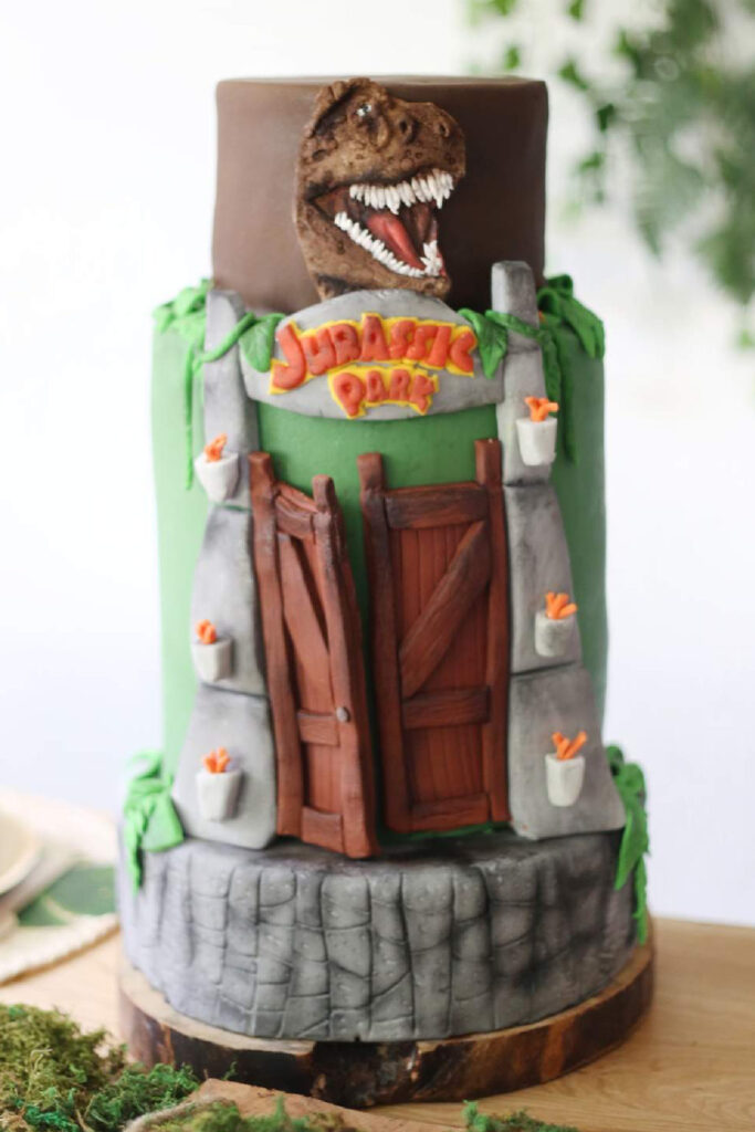 I crafted a cake with a Jurassic Park logo and edible dino figures for a bold centerpiece. It wowed everyone. It’s a nice idea because it’s iconic and thematic, turning a small table into a prehistoric focal point with minimal space needed.