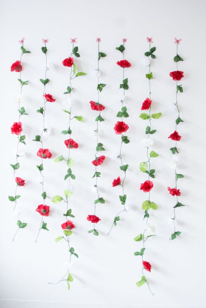 I wove Dollar Tree artificial flowers into a vine for a stunning photo backdrop. It draped beautifully over a table. It’s a nice idea because it’s elegant and budget-friendly, creating a lush, romantic setting for birthday photos in a small area.