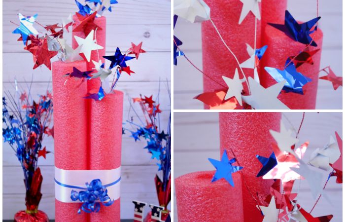 Using Dollar Tree pool noodles, I made oversized firecrackers with red and blue wrapping paper. They stood out as bold decor pieces. It’s a nice idea because it’s eye-catching and cheap, adding a playful, explosive vibe to a small birthday celebration space.