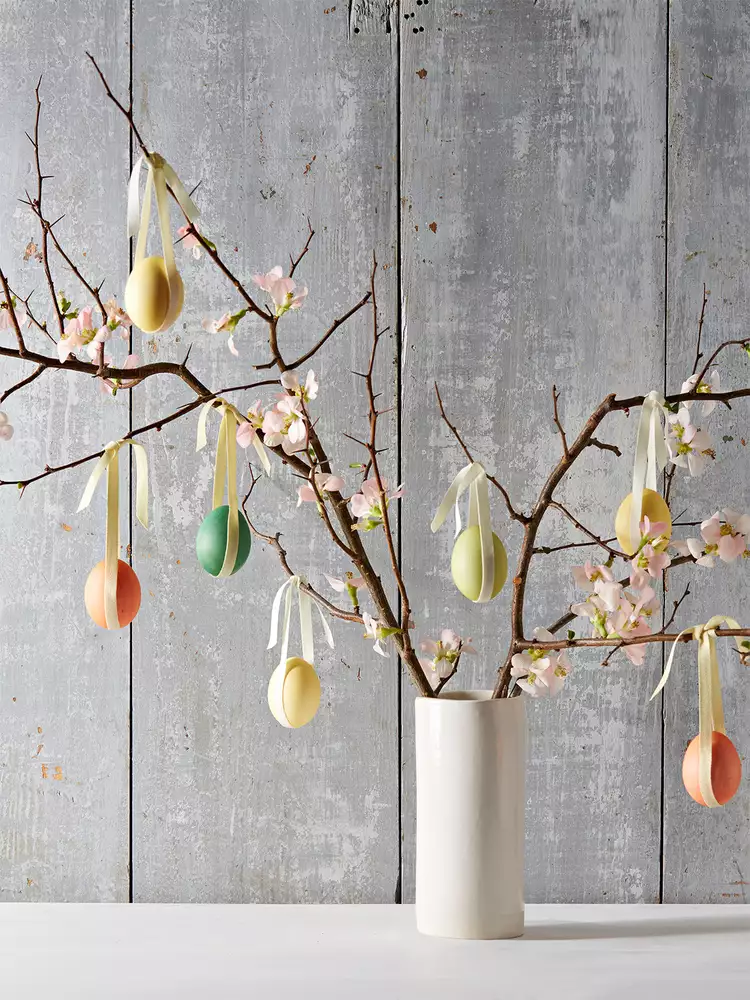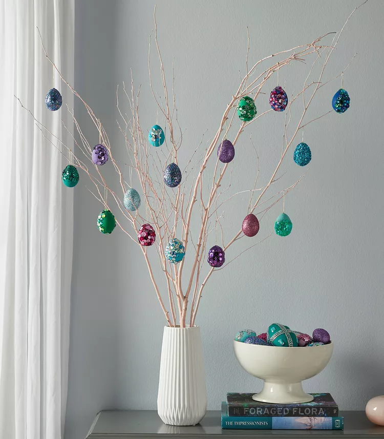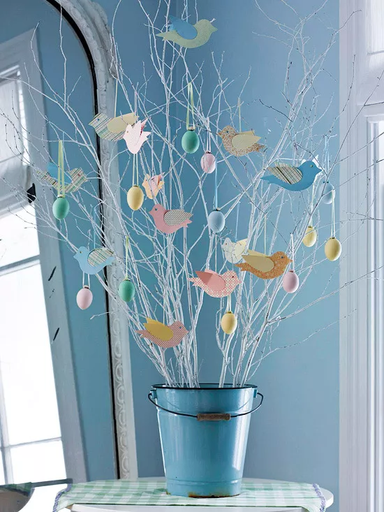 I painted my tree’s branches white and hung pastel eggs and ribbons. It looked soft and dreamy. It’s a nice idea because it’s calming and cohesive, creating a serene Easter vibe in a small area.
