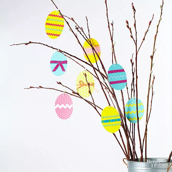 I cut egg shapes from colorful paper and hung them with twine for a simple, cheerful tree. It was budget-friendly. It’s a nice idea because it’s easy and customizable, filling a small space with bright Easter spirit.