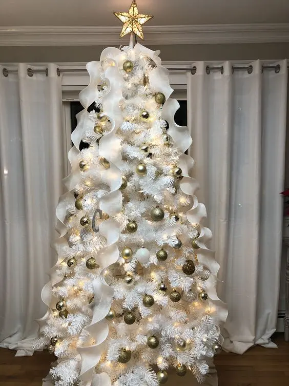 Opt for a white artificial tree draped with gold and white ornaments and soft white ruffle ribbons. Top with a glowing tree topper to illuminate the room, evoking a chic, frosty holiday vibe.