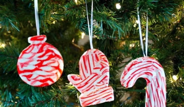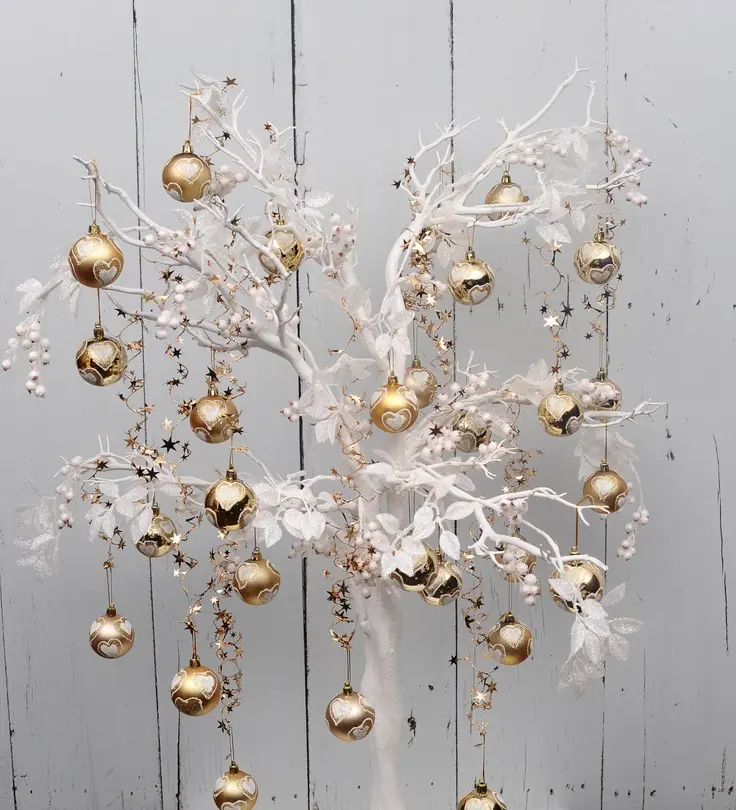 Decorate a white, snowy tree with white fabric leaves and shimmering gold ornaments. The textured foliage paired with metallic accents creates a soft, wintry aesthetic that’s both modern and festive.