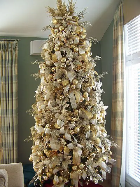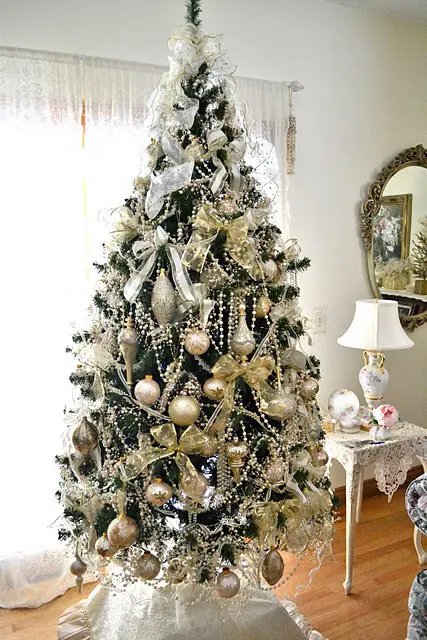 Craft a glamorous tree with layers of gold and white ornaments, intertwined with matching ribbons. The harmonious color scheme and intricate details make this a show-stopping centerpiece for a chic holiday setting.