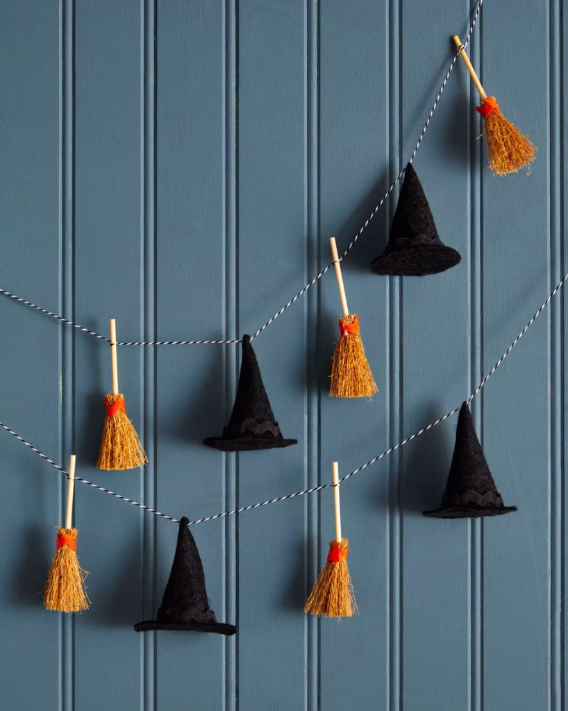 I strung mini brooms and witch hats along a garland to hang above my party table. This quirky decor screams Halloween fun. It’s a nice idea because it’s lightweight, easy to hang, and adds a playful, witchy vibe to your birthday celebration without cluttering the space.