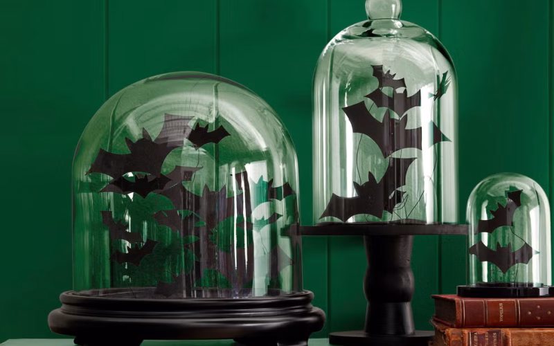 I placed tiny bat figures under glass cloches, creating a spooky yet elegant display. These bat cloches can sit on a side table or shelf. It’s a nice idea because they’re small, reusable, and add a touch of gothic sophistication to your Halloween birthday setup.