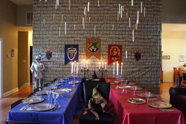 Set tables with black tablecloths, gold plates, and floating candle lanterns (battery-operated). Add house banners for a grand, Hogwarts dining hall vibe perfect for feasting.