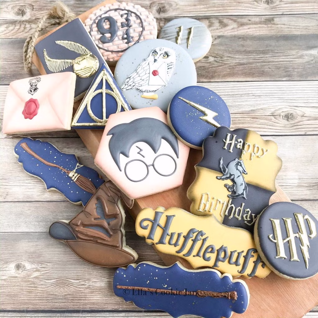 Bake cookies shaped like Hogwarts crests or broomsticks, iced in vibrant colors. Stack on a wooden board with a “Hogwarts Feast” sign for a thematic treat.