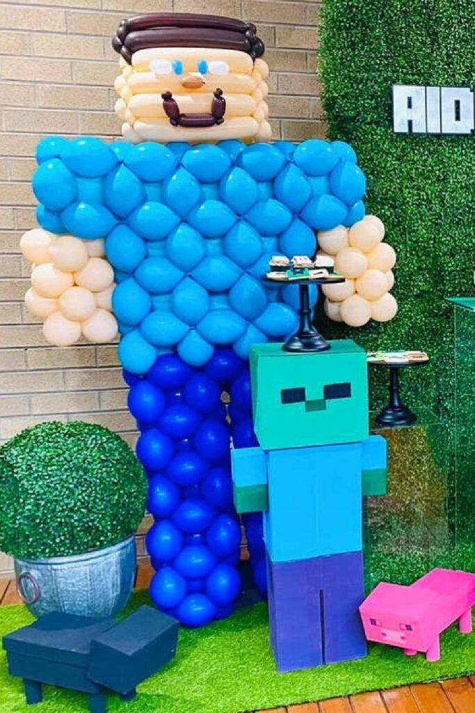 Create balloon clusters shaped like Minecraft blocks (grass, diamond, TNT) in green, blue, and red. Anchor with pixelated weights for a floating, game-inspired display.
