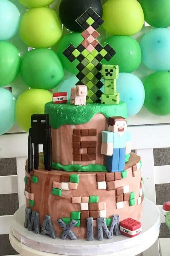 Create a tiered cake with fondant blocks, Creepers, and a Steve topper. Place on a wooden stand with a “Level Up!” banner for a show-stopping centerpiece.